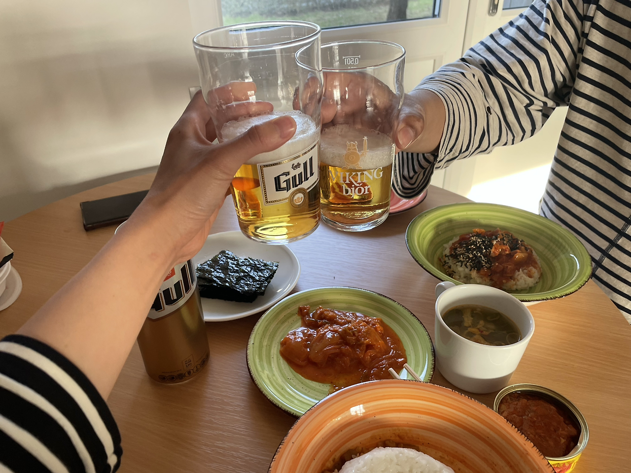 서울서 공수해온 오뚜기밥, 비비고 볶음김치, 동결건조 된장국, 김 그리고 맥주로 저녁식사