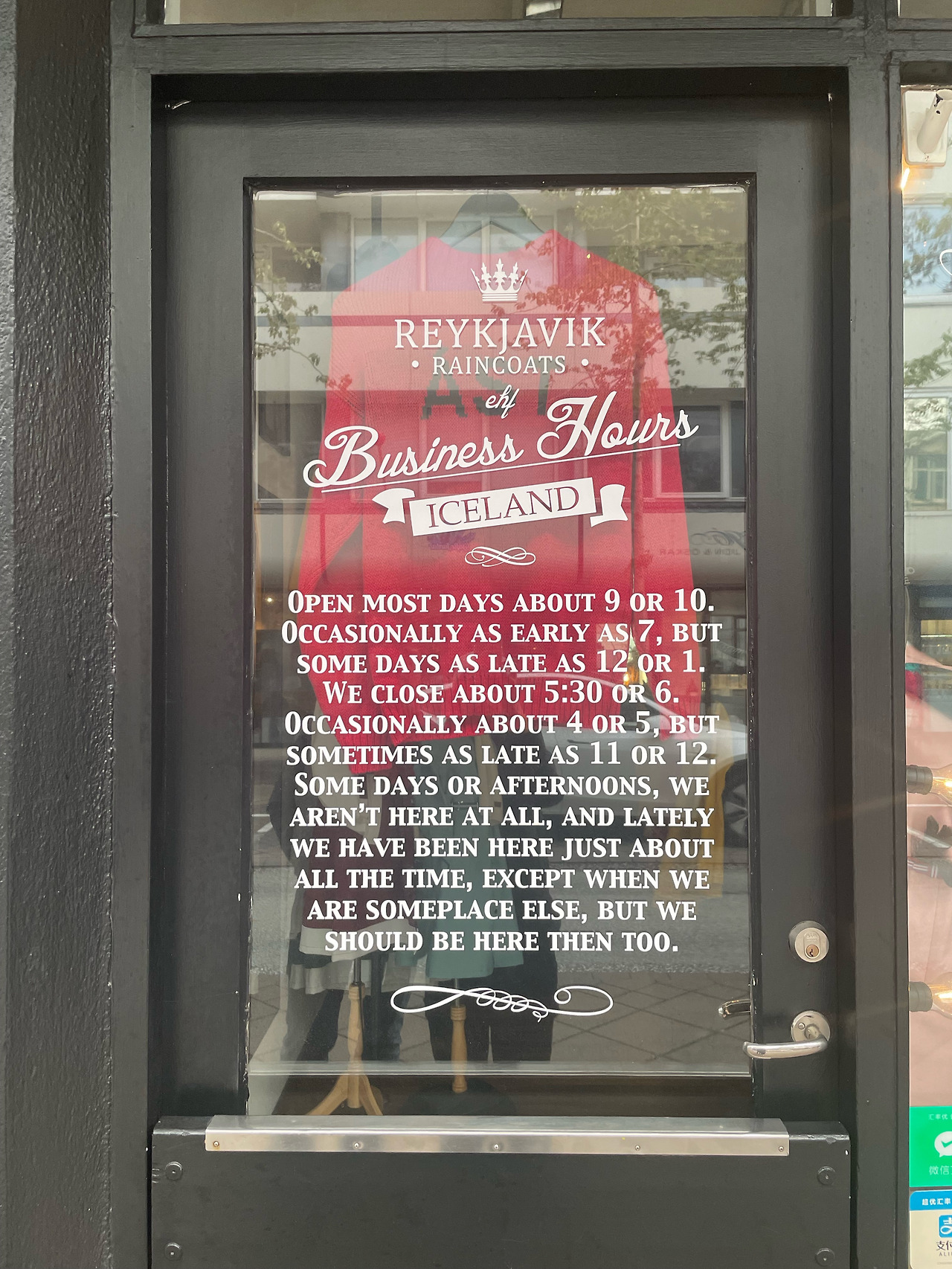 대부분 9시나 10시에 열지만 어쩔 때는 일찍 7시에 열기도 하고 며칠은 12시나 1시에 늦게 열기도 해. 5시 반 아님 6시에 닫긴 하는데 또 4시나 5시에 일찍 닫을 수도 있고 아님 11시 12시까지 하기도 해~~~ 이것이 아이슬란딕 유모어인가?