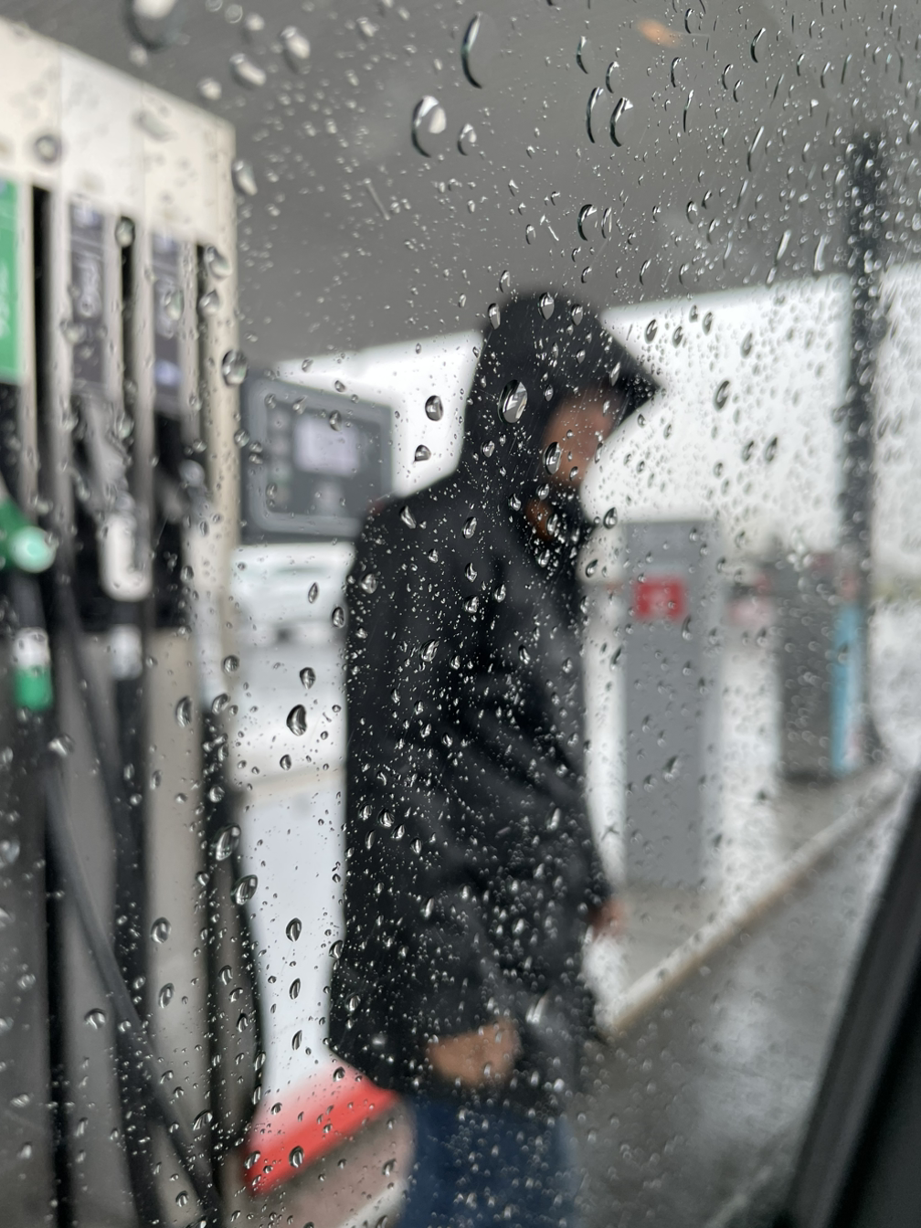 비를 뚫고 주유하시는 남편님. 우비를 입고 무적이다!