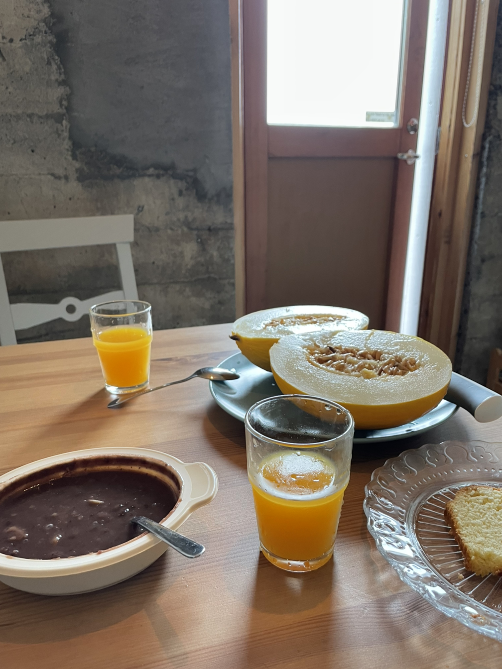 한국에서 사 온 비비고 단팥죽이랑 벼노사 출신 주인아주머니가 구운 파운드빵, 오렌지주스, 노랑 멜론으로 아침을 먹는다.