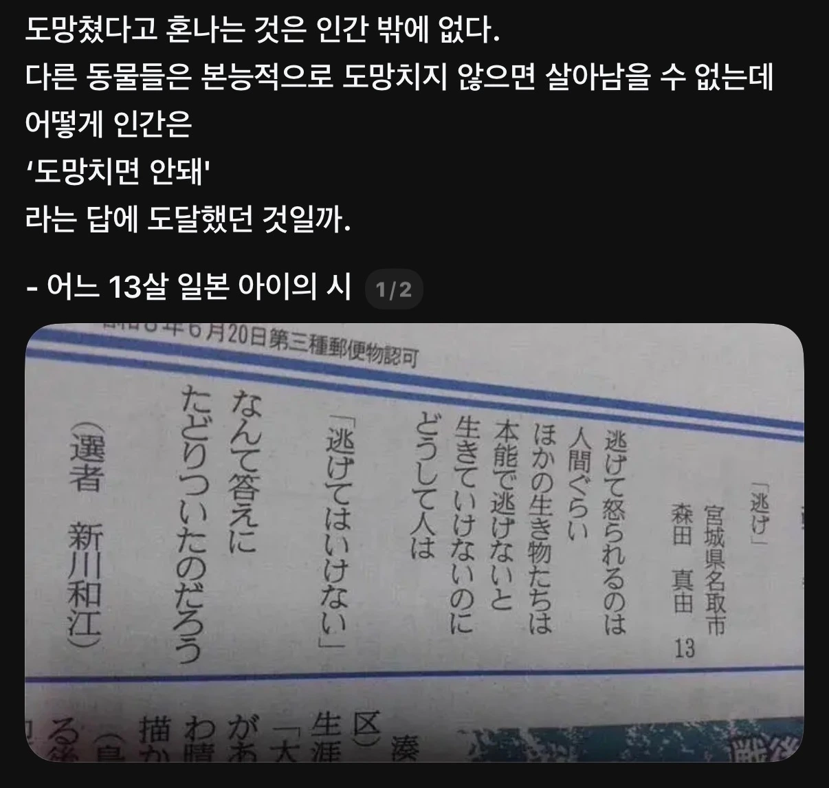 온라인에서 좋아요를 수없이 받은 어느 13살 아이의 시가 있다. 도망쳤다고 혼나는 것은 인간밖에 없다.