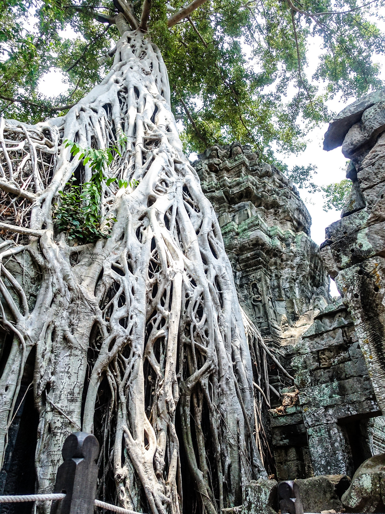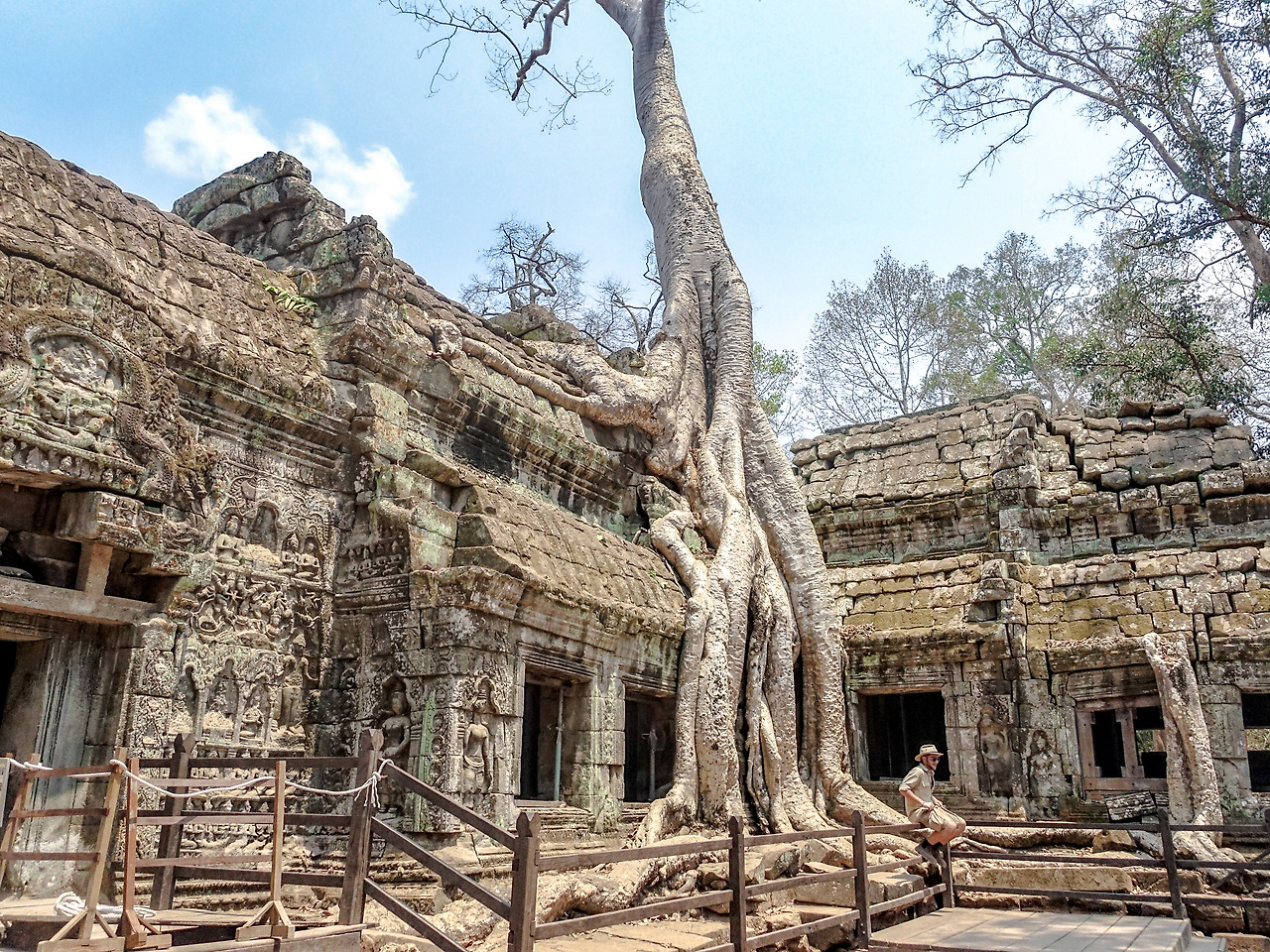 오후의 첫 방문지는 안젤리나졸리(늘 '안졸리나 젤리'로 헷갈린다) 주연의 영화 '툼레이더'의 촬영지로 유명한 '타 프롬(Ta Prohm)'이다. 이곳은 앙코르 사원들 중에서도 특이하게 거대나무들에 의해 사원 대부분이 침식되어 무너진 모습이다. 나무들이 계속 자라면 사원 전체가 파괴될 것으로 우려되어 유적보호를 위해 성장억제를 시키고 보강공사만 할 뿐 나무 자체는 제거하지 않아 타프롬만의 독특한 매력을 유지하고 있다.