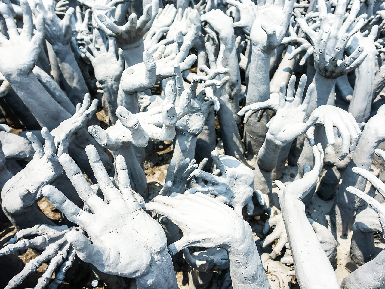 찰름차이 코싯피팟(62)이 디자인한 ‘백색 사원(The White Temple)’은 반대로 하얀 세상이었다. 열반(涅槃)의 세계를 밝은 흰색으로 표현했단다. 반면 현세는 절망적으로 묘사했다. 사원 입구에 절규하는 듯한 인간의 손 수백 개가 조각돼 있었고, 사원 내부의 벽화는 지구를 불구덩이 지옥처럼 표현했다.