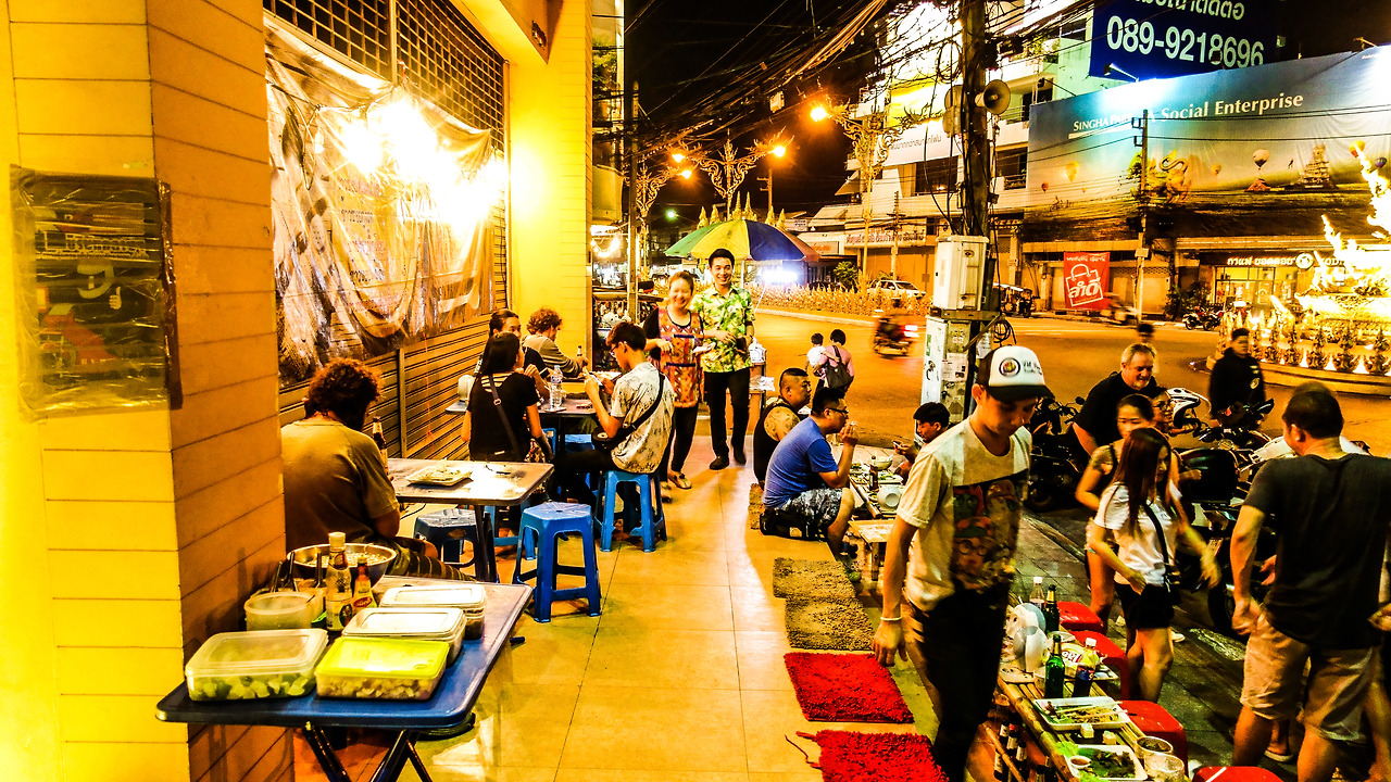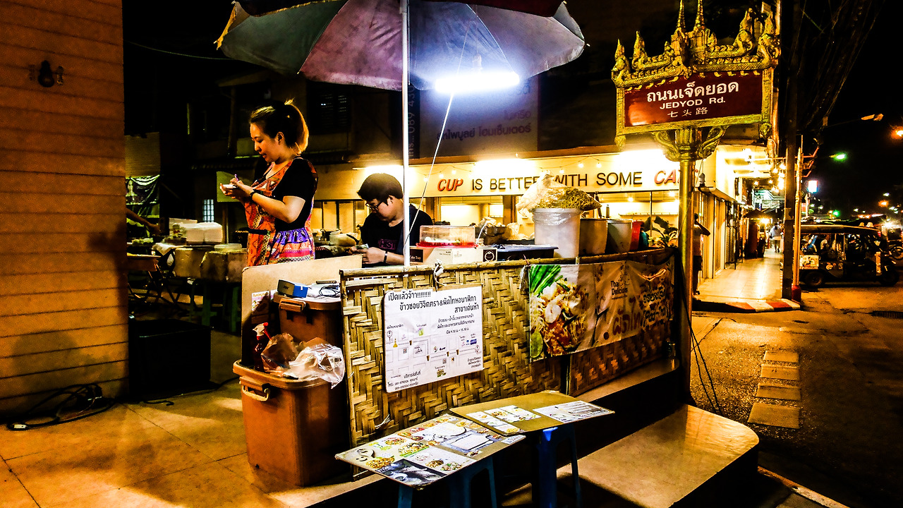 그 순간 치앙라이의 명물 황금시계탑이 보이는 근처 노상에 펼쳐진 간이 식당이 내 눈에 아니 내 마음에 들어온다.