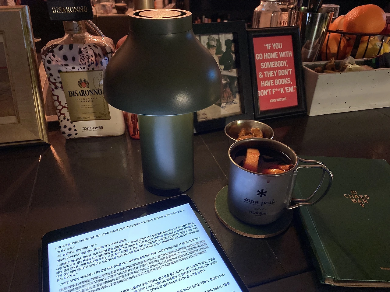 막 책에 빠져들었을 때, 스노피크 티타늄 컵에 따뜻한 레드와인이 과일을 한가득 머금고 시나몬 향을 풍기며 등장했습니다. 그 달달함이 좋아서 홀짝홀짝 들이켰는데, 어느새 살짝 기분이 좋은 취기가 느껴졌습니다. 그리고 처음으로 책을 읽을 때, 조금의 알코올을 기운을 빌리면, 정말 집중력이 더 잘된다는 것을 알게 되었습니다. 제가 바로 책 속의 노사이드 바에 있는 듯한 느낌이 들어 참 좋았습니다.