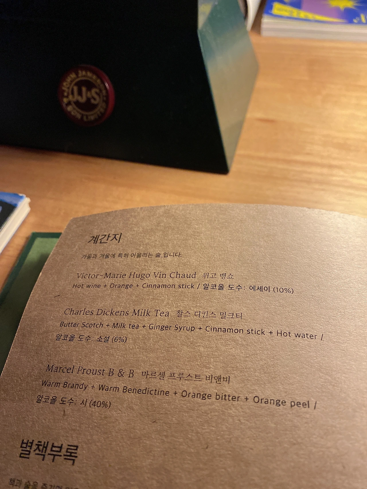 오늘 이 책을 들고 저만의 노사이드, 책바를 찾아보았습니다. 책바에 들어선 순간, 이미 공간을 채운 책들과, 한잔씩 하면서 책을 읽고 있는 사람들의 모습에 따뜻함을 느꼈습니다. 이곳의 아이덴티티가 그대로 드러나는 메뉴판을 정독하다가, 오늘은 '뱅쇼'를 주문했습니다.