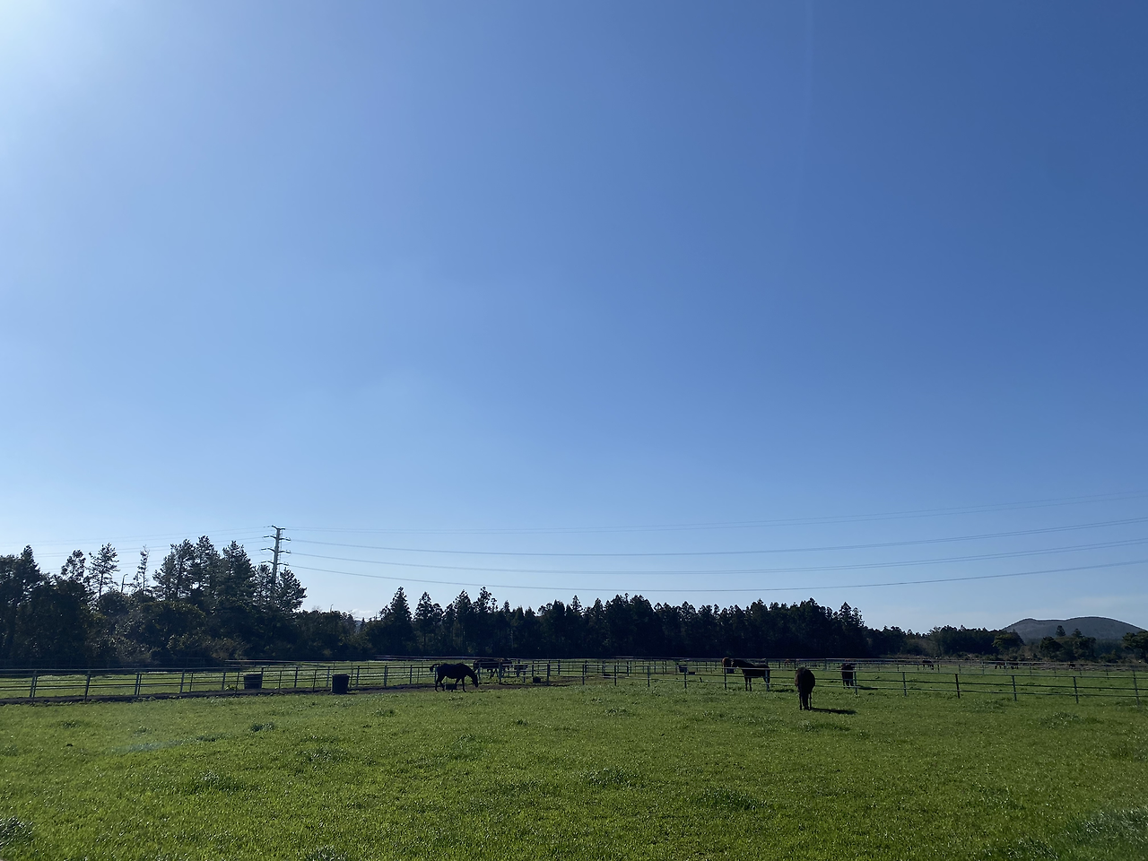 하지만, 아무래도 걷다 보면 여자 혼자 뚜벅이 제주여행은 쉽지 않음을 매 순간 생각합니다. 때마침 모퉁이를 도니 펼쳐지는 목초지 위의 매끈한 말들이 풀을 뜯고 있습니다. '이거지! 내가 좋아하는 말! 내가 이런 걸 보러 왔지~'하는 생각과 함께 뚜벅이 여행의 묘미를 느낍니다.