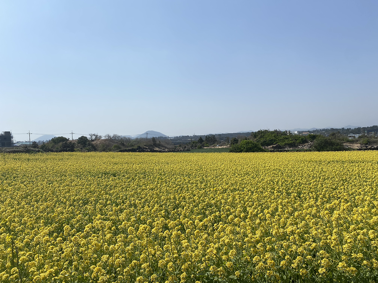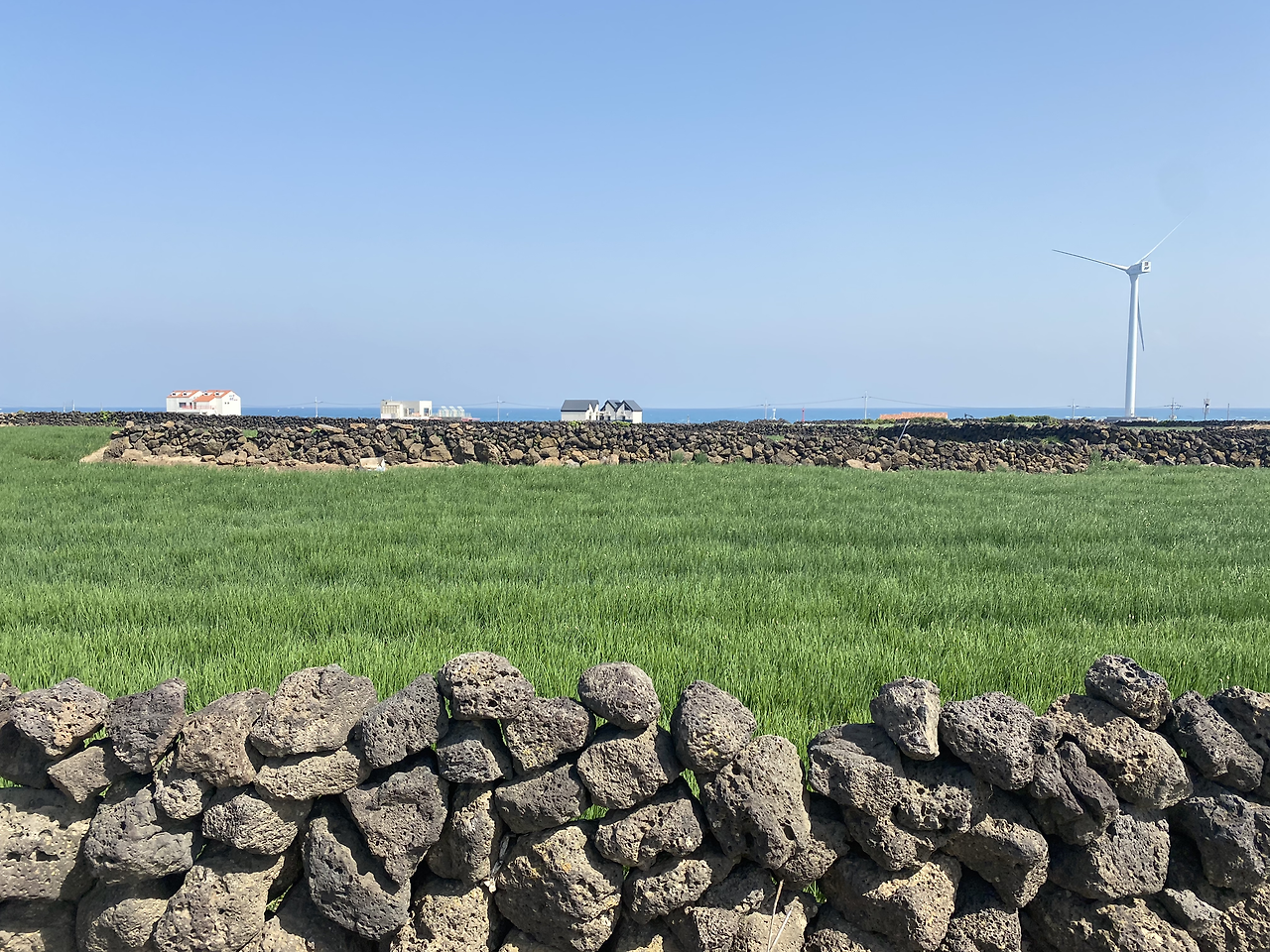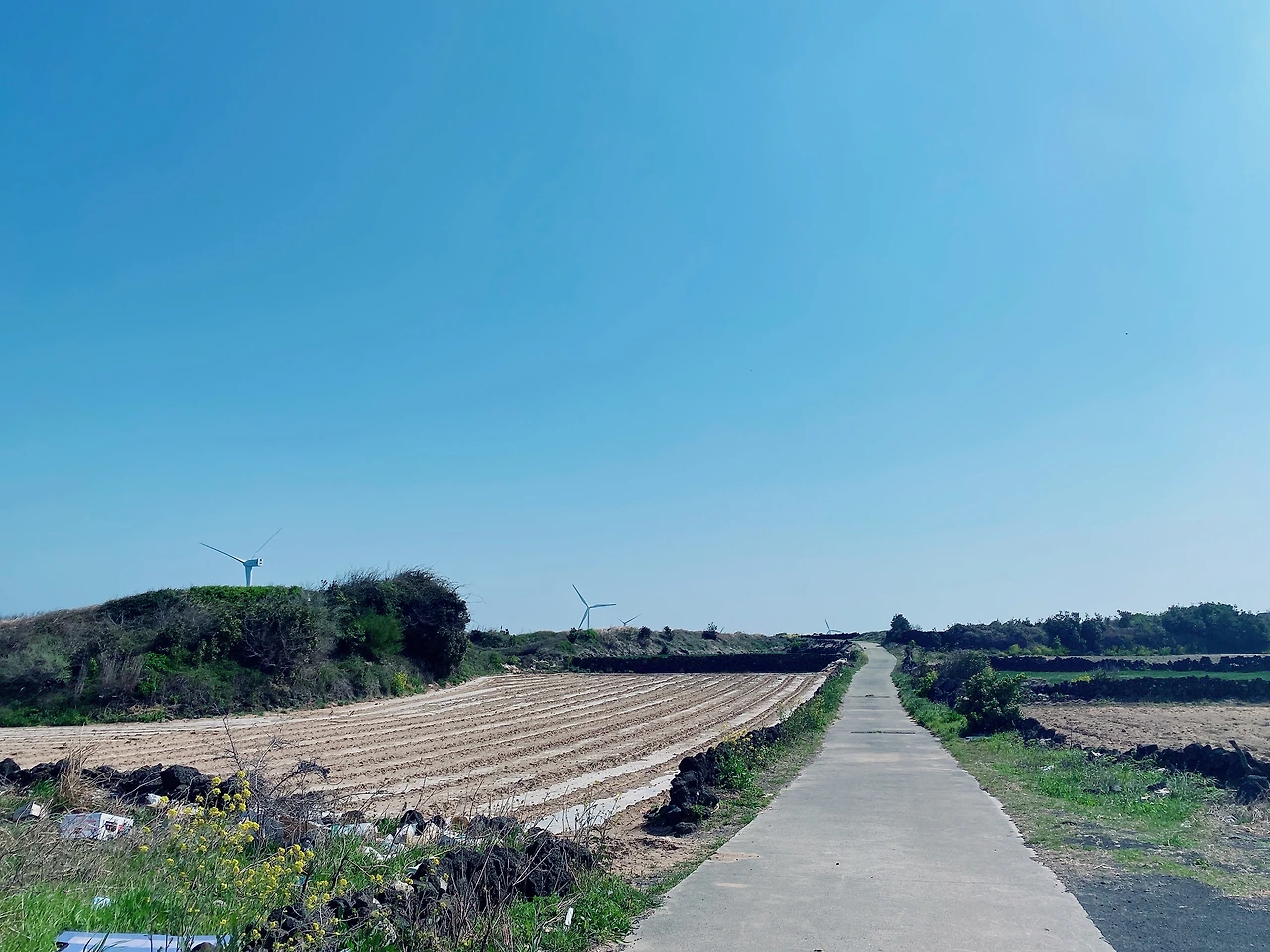바다를 지나 올레길을 따라 걸으니 나오는 시골길. 이곳에서 다시금 울컥해짐을 느낍니다. 검고 구멍이 숭숭 뚫린 현무암 돌벽으로 피어난 노란 유채꽃밭 그리고 풍력발전소에서 돌아가는 거대한 바람개비. 이곳에서 숨 쉬고 그대로 느끼는 이 순간 살아있음이 마음 가득 차오릅니다.