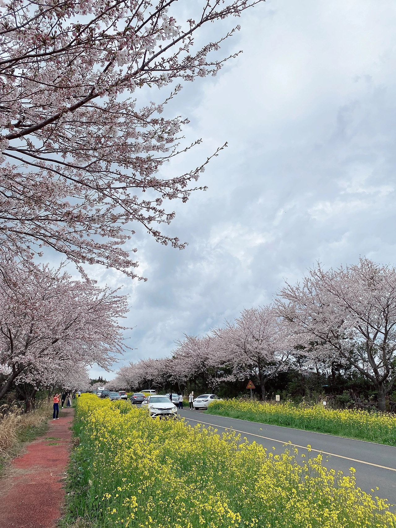 "여태껏 차 없이 걸어 다녔어요? 오늘은 내가 기사 해줄게요. 가고 싶은데 다 말하슈." 이래도 되나 싶었지만 그동안 걷는 것이 너무 고되어 이제는 차로 이동하고 싶었습니다. 제주에 온 지 오일째. 뚜벅이 여행에 진짜 지쳤습니다. 그래서 보고 싶었던 벚꽃도로 '가시리의 녹산로'에 가보고 싶다고 말했습니다. 제일 좋은 날씨에 만개한 꽃이 져버릴까 조바심 나던 마음도 있었습니다. 어느새 보조석에 타고 녹산로로 향합니다.