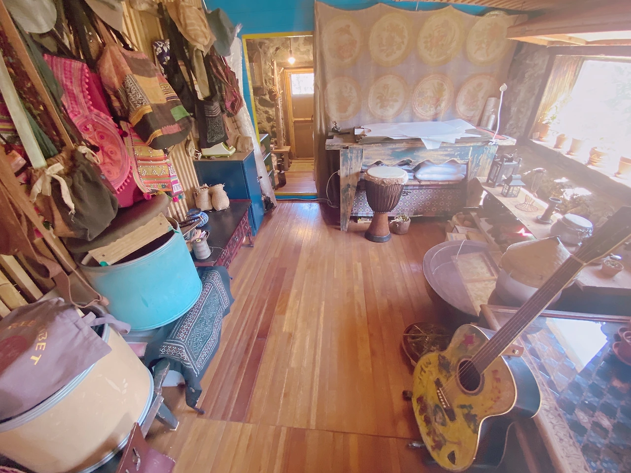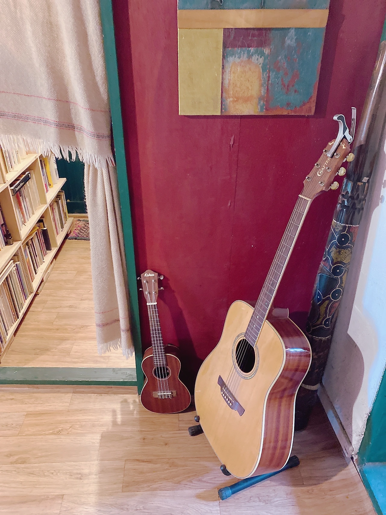 민박집 사장님께서 주신 조식은 그야말로 '유기농 브런치'였습니다. 마당의 평상에 앉아서 따뜻한 원두커피와 직접 만드신 귤잼을 발라 먹는 토스트는 꿀맛이었습니다. 이 민박집 사장님은 여행을 좋아하셔서 티베트 한 달 살기도 해 보시고 라오스 캄보디아 등 동남아 여행을 많이 하셨다고 했습니다. 그래서인지 집안에 기타도 장신구도 이국적인 느낌이 많이 났습니다.