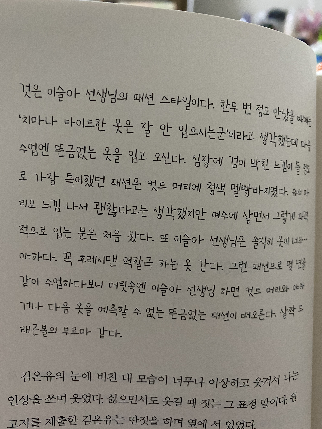이슬아 작가는 매일매일 쓴 글을 이메일로 구독자에게 발송하면서, 1달 구독료 만원을 받는 것으로 잘 알려져 있습니다. 저는 2020년 한여름 호를 구독했었고, 그녀의 글을 매일 읽던 9월 하루하루가 늘 마음이 몽글몽글했었습니다. 그녀가 세상을 바라보는 솔직하고 발칙한 시선, 그리고 표현력이 저의 글샘을 마구 자극했더랬습니다. 그런 그녀의 이번 책 <부지런한 사랑>에서는 그녀가 아이들에게 글쓰기 선생님을 하면서의 이야기를 소개합니다. 특히나 좋은 건 아이들의 작문 숙제를 읽는 것입니다. 아이들의 시선과 표현력은 일상에서, 회사에서 능글맞고 여우 같은 어른들 세계에 지친 저를 위로해줍니다. 그리고 그 아이들이 쓴 진지한 글을 읽다 보면 제게 참신한 웃음을 안겨줍니다.