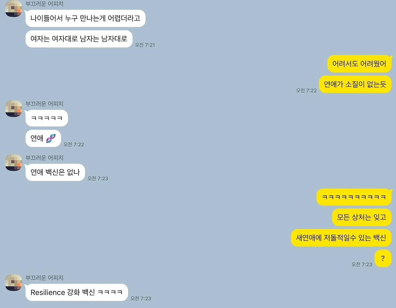 두 번째, 웃깁니다. 고민을 왜 털어놓았겠습니까. 신경이 쓰이기 때문입니다. 내 마음을 떠나지 않는 불편한 마음 때문입니다. 그런데 이 친구는 그 고민을 어렵사리 털어놓은 것을 부끄럽지 않게 해 줍니다. 그리고 그 상황을 매우 유쾌하게 해석해줍니다. 예를 들면, 이렇습니다. 썸이 끝나고 남은 감정 치유에 허덕이는 저에게 적당한 색드립을 날리며 웃겨줍니다. 그녀와의 대화를 통해 한바탕 웃고 나면, 제 고민이 아무것도 아닌 것이 됩니다. 나만 지질한 것 같고, 나만 불안한 것 같았던 내면의 웅크린 아이는 웃음 속에서 저 멀리 사라집니다.
