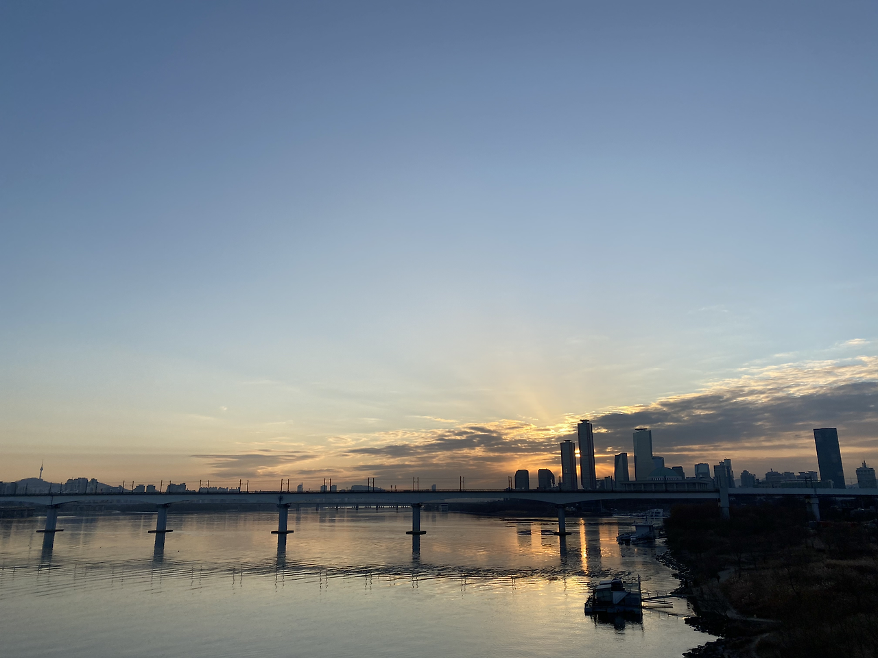 마음속으로 외치던 말이 입 밖으로 흘러나왔습니다. 눈앞에 양화대교가 보였습니다. 뛰어서 도착한 순간 너무 아름다운 해가 보였습니다. 바다에서 고개를 내미는 순간은 조금 지났지만, 제가 10년을 넘게 일하고 있는, 매일매일 출근하는 여의도의 빌딩 사이로 해가 떠오르면서 아름다운 광채를 뿜어내고 있었습니다. 걸어가는 내내 아름다운 일출을 보았습니다. 그리고 제가 어젯밤 찜 콩해두었던 포인트에서도 보고, 선유로에서도 보았습니다.