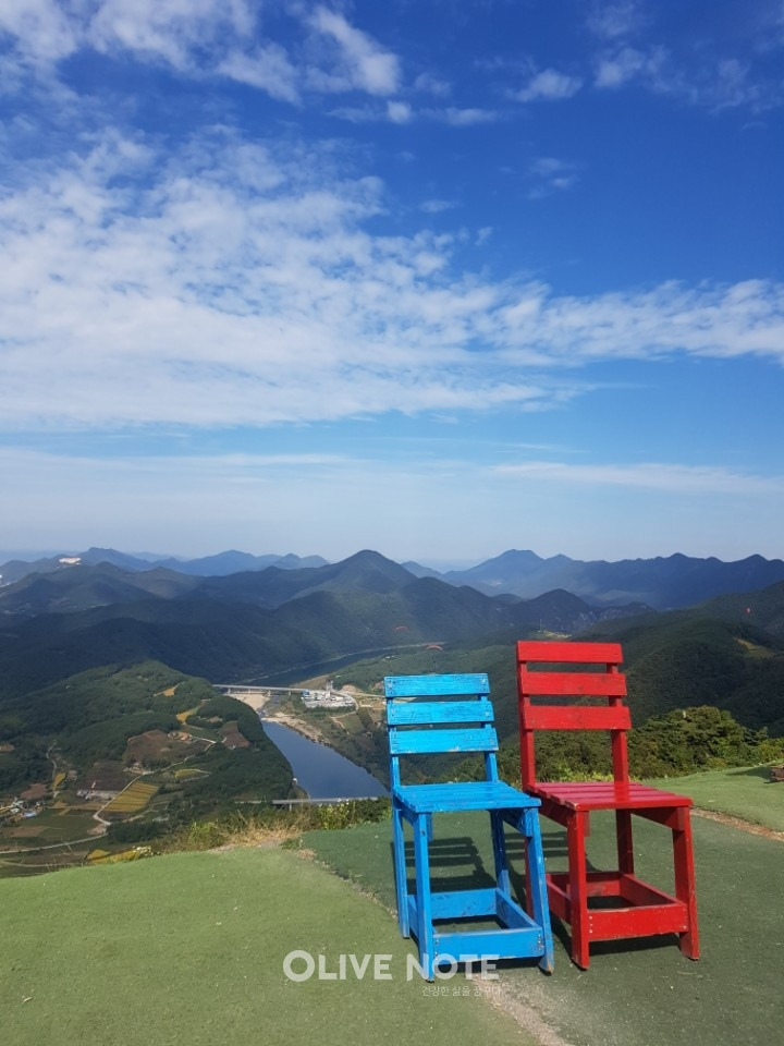 카페 산에 가면 일단 탁 트인 전망에 아이들이 감탄사를 연발합니다. 예쁜 의자에 앉아 엄마 아빠와 함께 인생샷을 한 장 찍고요. 여기서 반드시 지켜야 할 사항! 이 끝은 낭떠러지입니다. 인생샷에 목숨 걸면 안 되겠죠? 특히 아이들의 안전은 반드시 사수해야 합니다. 너무 가까이서 찍지 않아도 충분히 굽이굽이 산자락이 한눈에 들어옵니다.