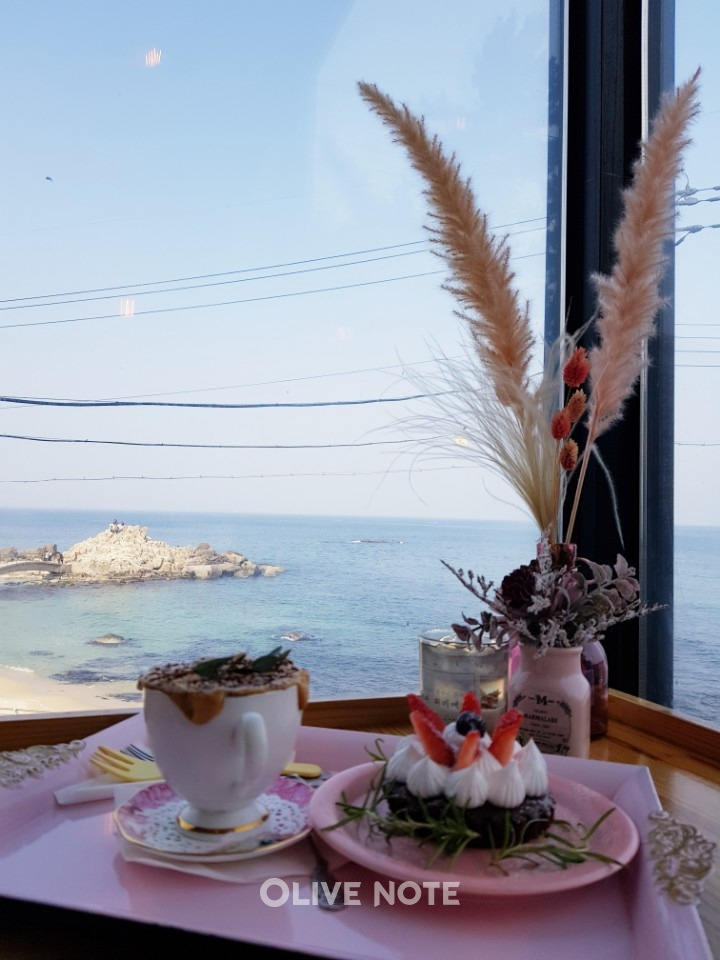 통유리 사이로 살짝 보이는 바다와 매우 매우 이쁘장하게 플레이팅 한 차, 케이크가 이 집이 유명세를 치른 첫 번째 이유고요. (사진만 봐도 아시겠죠?) 게다가 커피도 맛있어서 한번 찾은 손님들은 또 찾게 된다고 하네요.