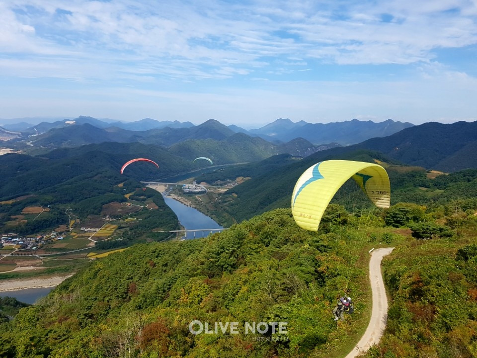 다음으로 이 풍광을 배경으로 하나 둘 떠오르는 오색빛깔 '패러글라이딩'을 보면 또 한 번 놀라실 겁니다. 새해를 각오하는 마음을 이곳 산에서 하는 것도 좋은 방법일 듯하네요.