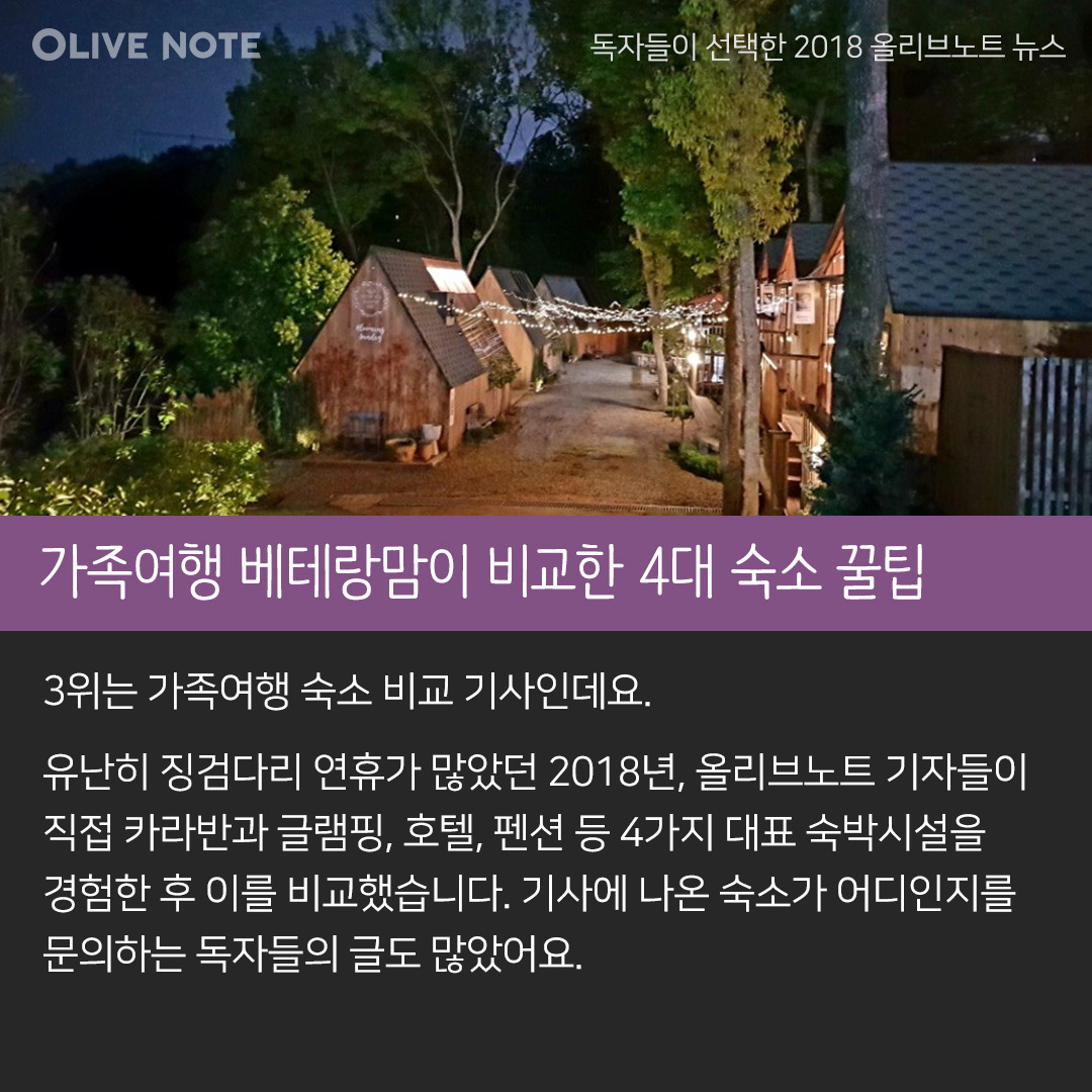 3위는 가족여행 숙소 비교 기사인데요. 유난히 징검다리 연휴가 많았던 2018년, 올리브노트 기자들이 직접 카라반과 글램핑, 호텔, 펜션 등 4가지 대표 숙박시설을 경험한 후 이를 비교했습니다. 기사에 나온 숙소가 어디인지를 문의하는 독자들의 글도 많았어요.