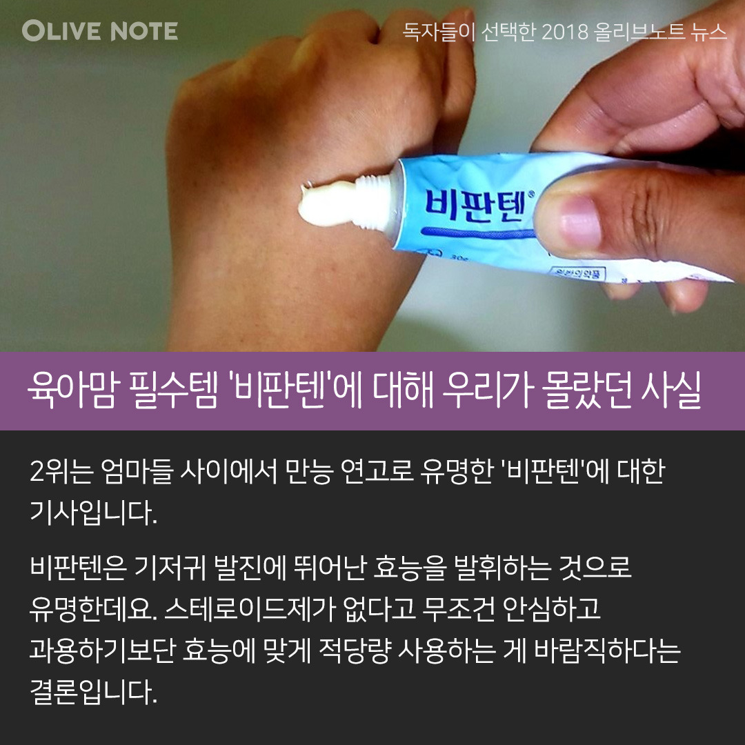 2위는 엄마들 사이에서 만능 연고로 유명한 '비판텐'에 대한 기사입니다. 비판텐은 기저귀 발진에 뛰어난 효능을 발휘하는 것으로 유명한데요. 스테로이드제가 없다고 무조건 안심하고 과용하기보단 효능에 맞게 적당량 사용하는 게 바람직하다는 결론입니다.