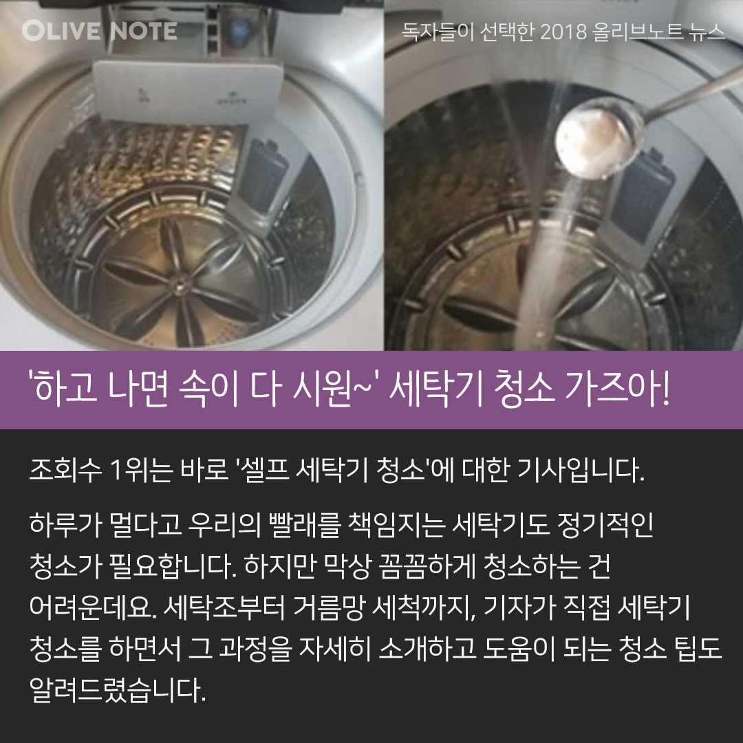 조회수 1위는 바로 '셀프 세탁기 청소'에 대한 기사입니다. 하루가 멀다고 우리의 빨래를 책임지는 세탁기도 정기적인 청소가 필요합니다. 하지만 막상 꼼꼼하게 청소하는 건 어려운데요. 세탁조부터 거름망 세척까지, 기자가 직접 세탁기 청소를 하면서 그 과정을 자세히 소개하고 도움이 되는 청소 팁도 알려드렸습니다.