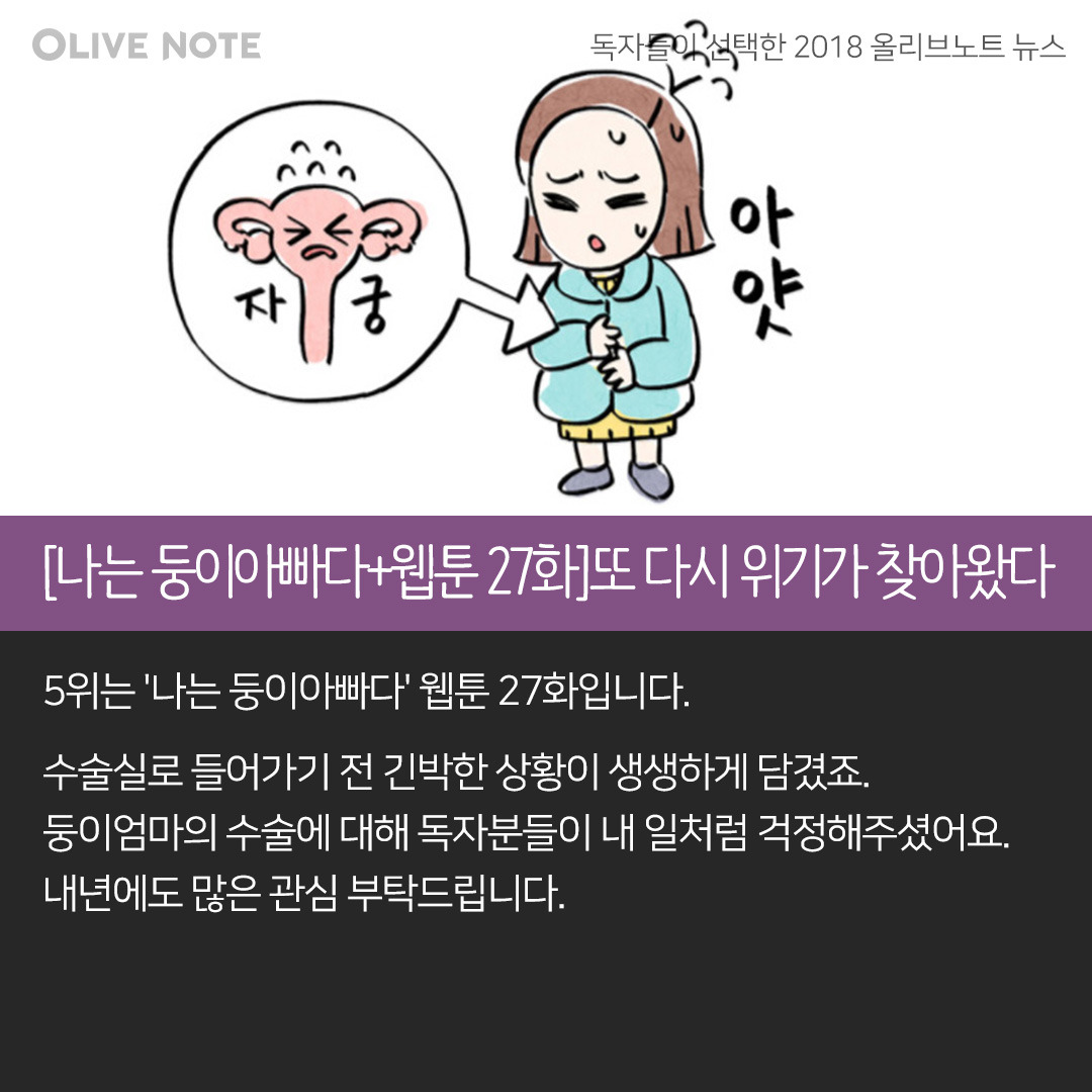 5위는 '나는 둥이아빠다' 웹툰 27화입니다. 수술실로 들어가기 전 긴박한 상황이 생생하게 담겼죠. 둥이엄마의 수술에 대해 독자분들이 내 일처럼 걱정해주셨어요. 내년에도 많은 관심 부탁드립니다.