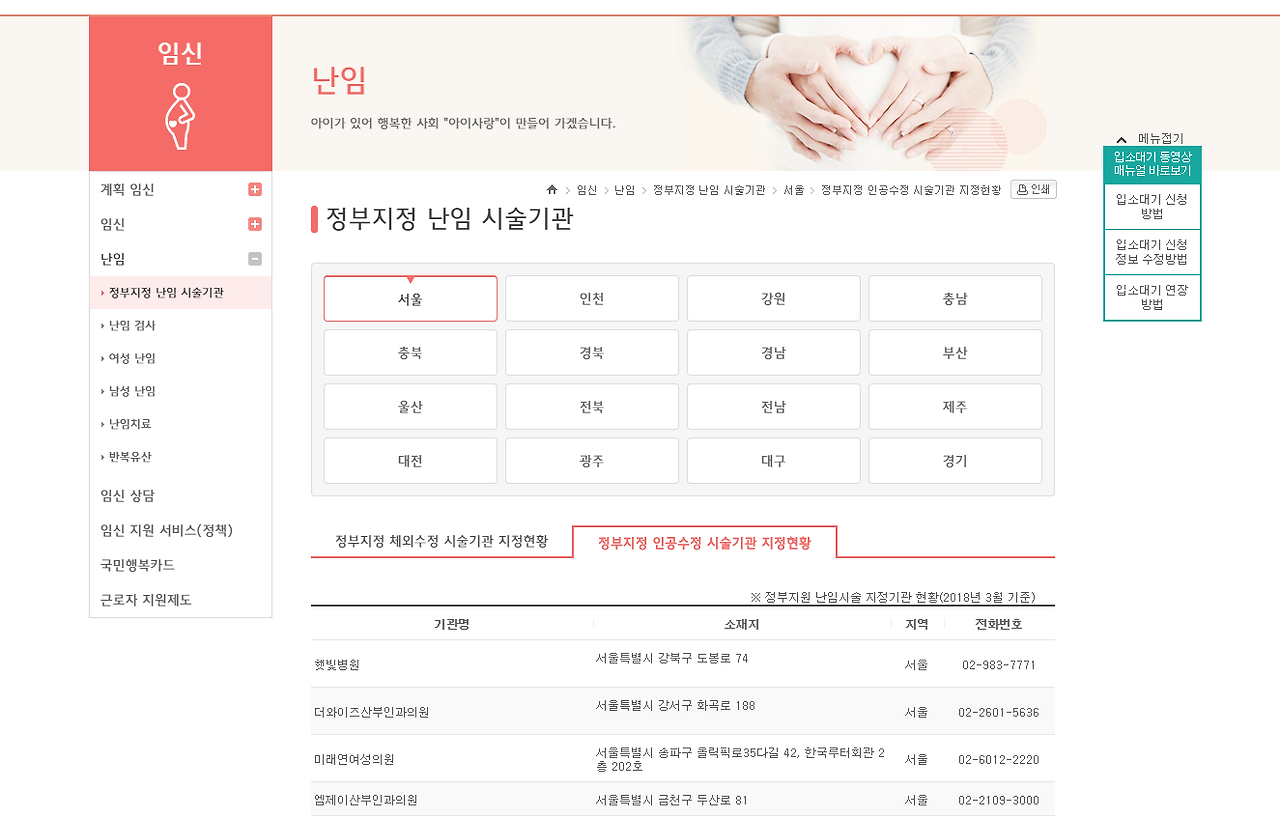 난임이 염려된다면 처음부터 체외수정, 인공수정을 시술하는 난임 전문병원을 찾는 것도 좋은 방법입니다. 개인병원에서는 난임 문제를 해결할 수 있는 시설이나 기기가 충분하지 않기 때문이죠. 이때 정부가 지정한 난임 시술 기관을 미리 확인해보면 좋습니다. 임신육아종합포털 아이사랑 홈페이지에서 체외수정을 시술하는 기관, 인공수정을 시술하는 기관을 각각 확인할 수 있어요.