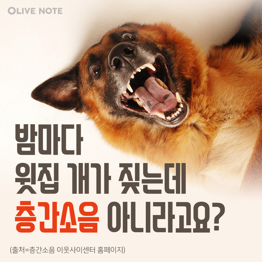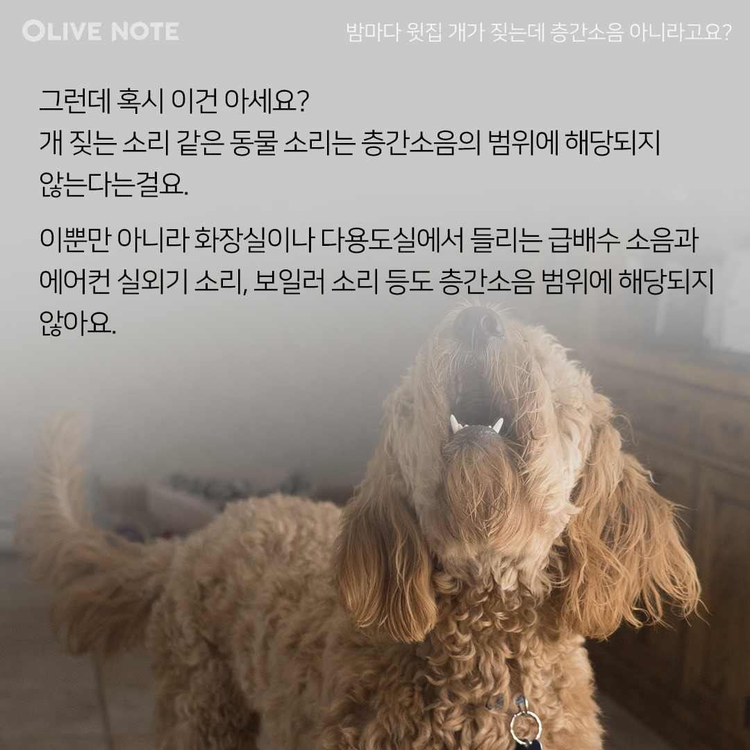 그런데 혹시 이건 아세요? 개 짖는 소리 같은 동물 소리는 층간소음의 범위에 해당되지 않는다는걸요. 이뿐만 아니라 화장실이나 다용도실에서 들리는 급배수 소음과 에어컨 실외기 소리, 보일러 소리 등도 층간소음 범위에 해당되지 않아요.