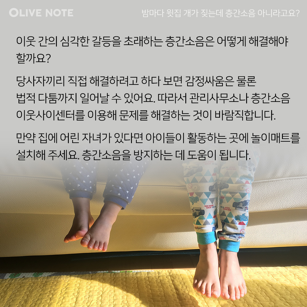 이웃 간의 심각한 갈등을 초래하는 층간소음은 어떻게 해결해야 할까요? 당사자끼리 직접 해결하려고 하다 보면 감정싸움은 물론 법적 다툼까지 일어날 수 있어요. 따라서 관리사무소나 층간소음 이웃사이센터를 이용해 문제를 해결하는 것이 바람직합니다. 만약 집에 어린 자녀가 있다면 아이들이 활동하는 곳에 놀이매트를 설치해 주세요. 층간소음을 방지하는 데 도움이 됩니다.