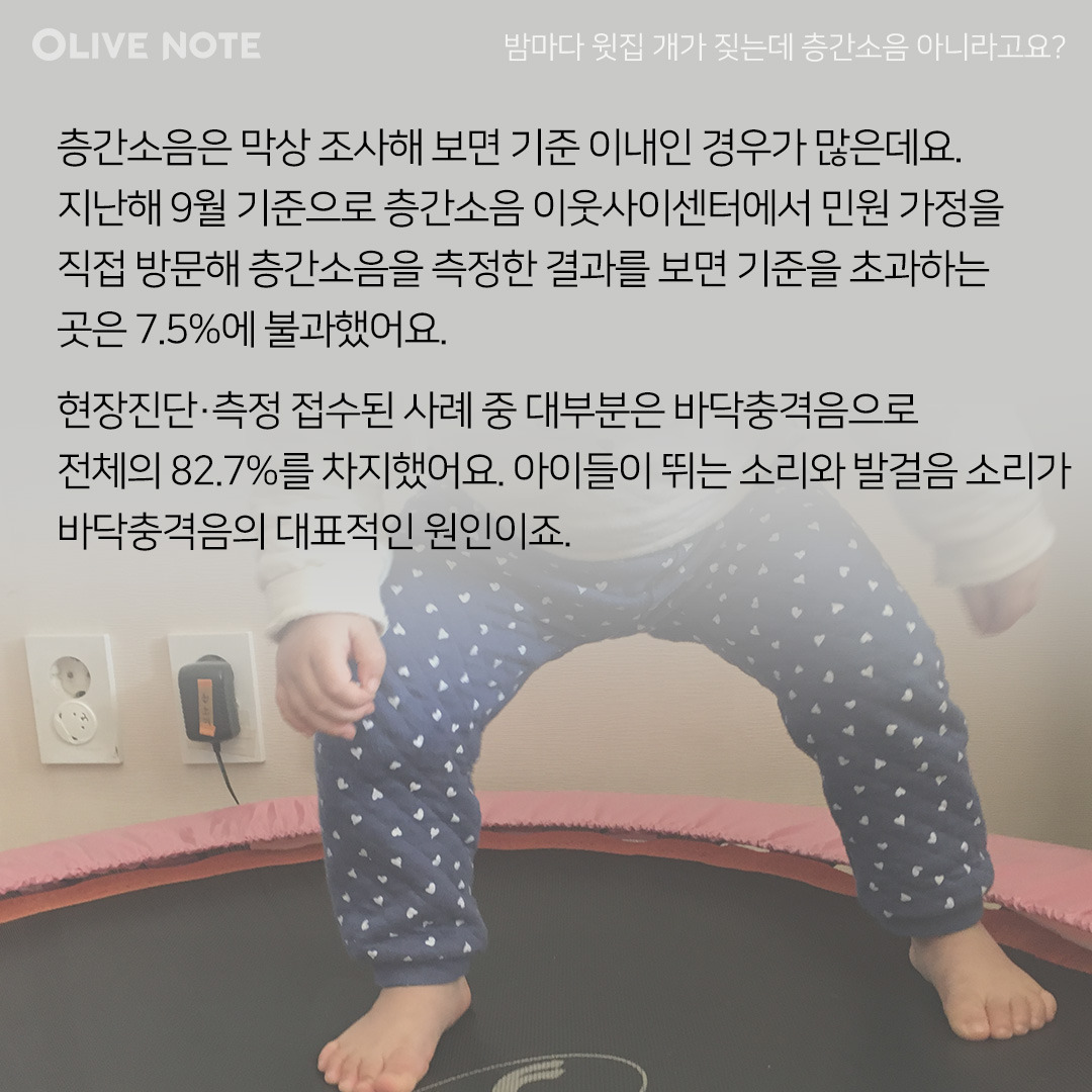 층간소음은 막상 조사해 보면 기준 이내인 경우가 많은데요. 지난해 9월 기준으로 층간소음 이웃사이센터에서 민원 가정을 직접 방문해 층간소음을 측정한 결과를 보면 기준을 초과하는 곳은 7.5%에 불과했어요. 현장진단·측정 접수된 사례 중 대부분은 바닥충격음으로 전체의 82.7%를 차지했어요. 아이들이 뛰는 소리와 발걸음 소리가 바닥충격음의 대표적인 원인이죠.