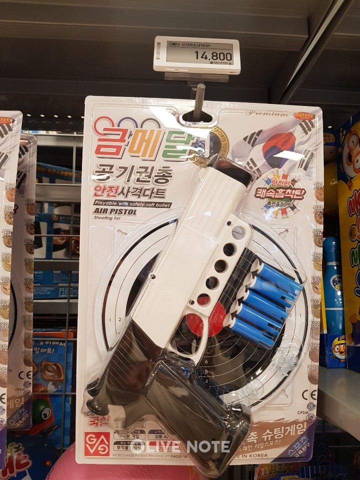 남자아이들이 좋아하는 총 놀이! 아이들이 좋아하지만 안전 문제로 잘 사주지 않는 장난감이기도 한데요. 금메달 공기권총은 안전하답니다. 비비탄 대신 흡착큐방이 붙어 있는 총알이라서 맞아도 아프지 않고요. 사격판도 흡착식이라 못을 박거나 벽에 그리지 않아도 돼요!