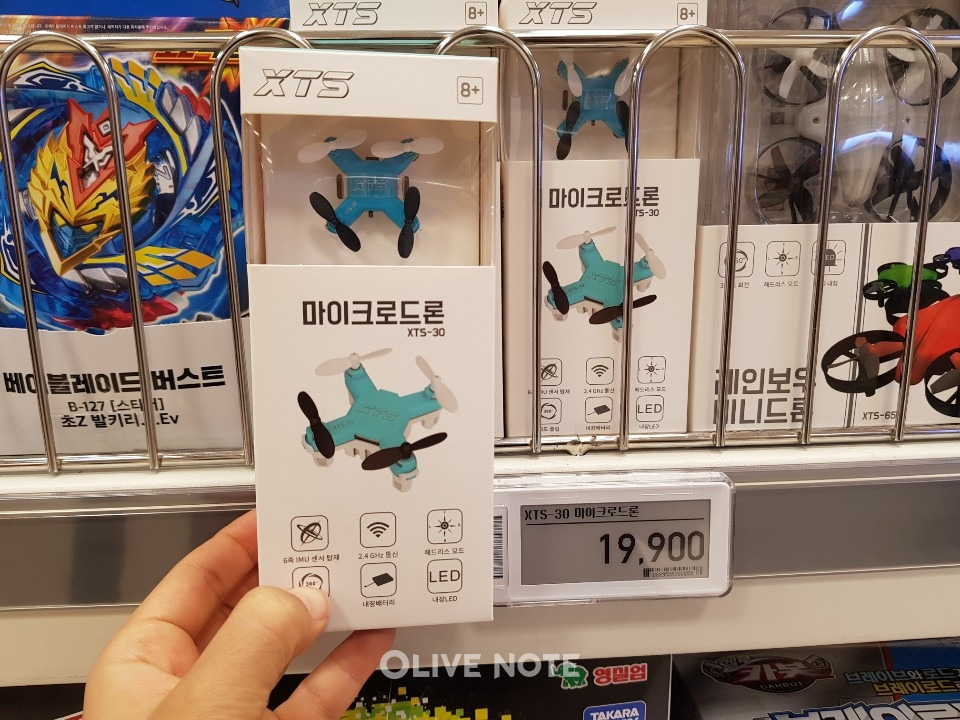 '드론'은 이제 남자아이들의 잇템이죠. 장난감 코너를 둘러보니 드론 가격이 정말 천차만별이더라고요. 어차피 몇 번 띄우다 보면 여기저기 부딪혀 고장 날 드론에 돈을 너무 많이 쓰면 아까워요. 그래서 연습용으로 작은 마이크로 드론을 사보는 건 어떨까요? 가격은 2만원이 채 안 되니 착한 편이에요. 크기는 아주 작지만 그래도 웬만한 기능은 다 있어요. △360도 공중회전(방향선택 가능) △속도 조절 3단계 △실내외 비행 △내장 LED 2컬러