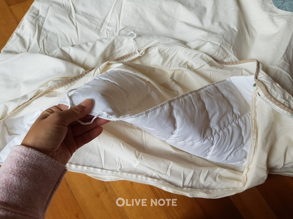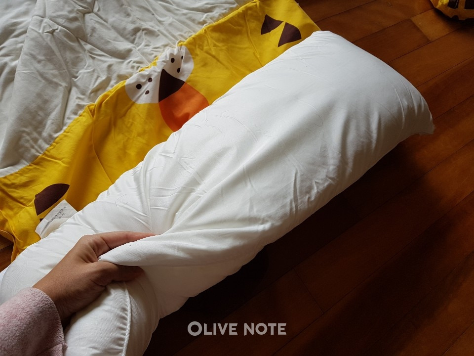두꺼운 이불은 베갯속도 빵빵하게 들어가 있는 경우가 많은데요. 제가 구매한 제품 중 하나도 이불 속은 물론 베갯속까지 솜이 너무 많이 들어가 아이가 잘 때 목이 불편하다고 했어요. 그런데 베갯속의 솜을 빼낼 수 없게 다 막혀 있어서 아예 베갯속을 뺀 후 크기가 맞는 다른 낮은 베갯속을 넣어줬답니다.