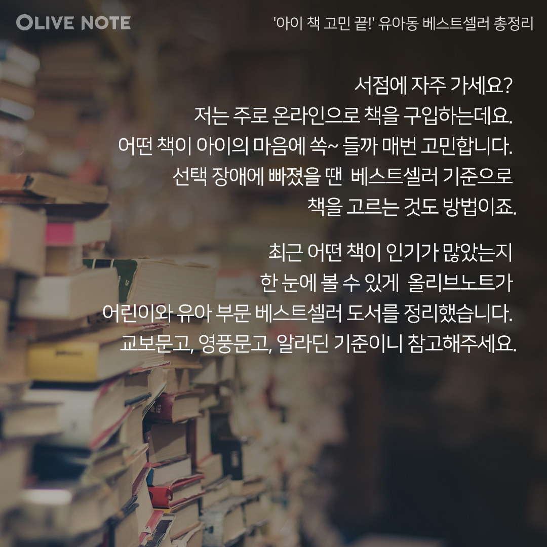 최근 어떤 책이 인기가 많았는지 한 눈에 볼 수 있게 올리브노트가 어린이와 유아 부문 베스트셀러 도서를 정리했습니다. 교보문고, 영풍문고, 알라딘 기준이니 참고해주세요.