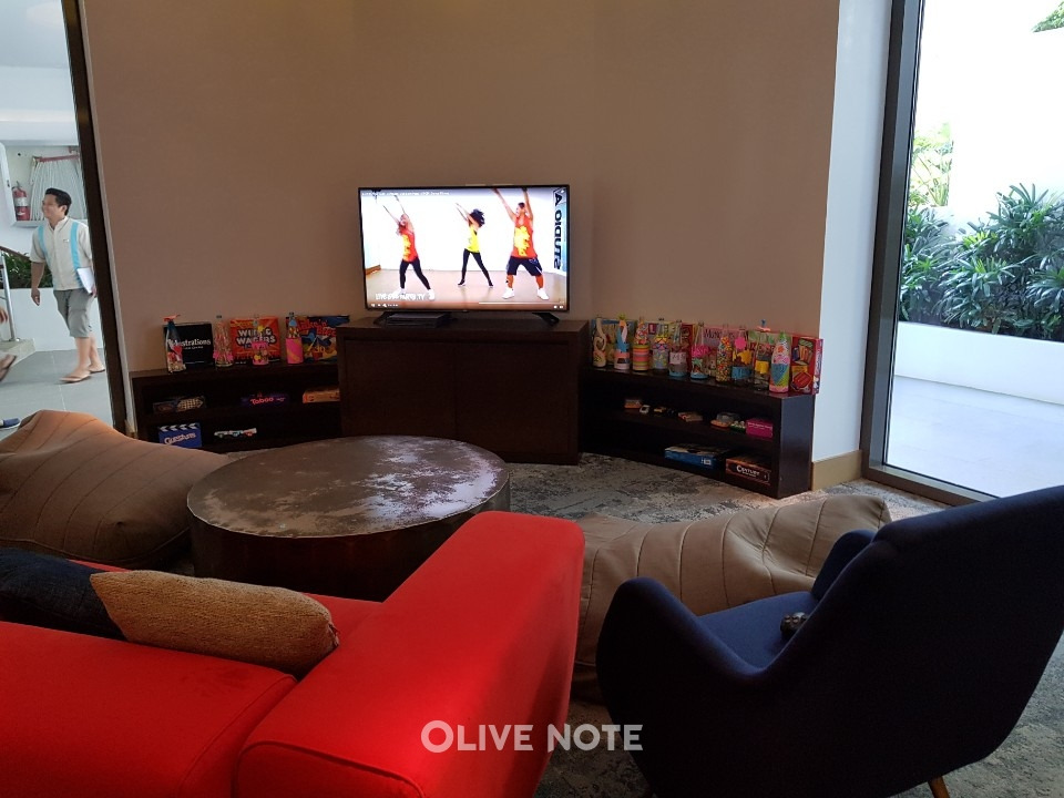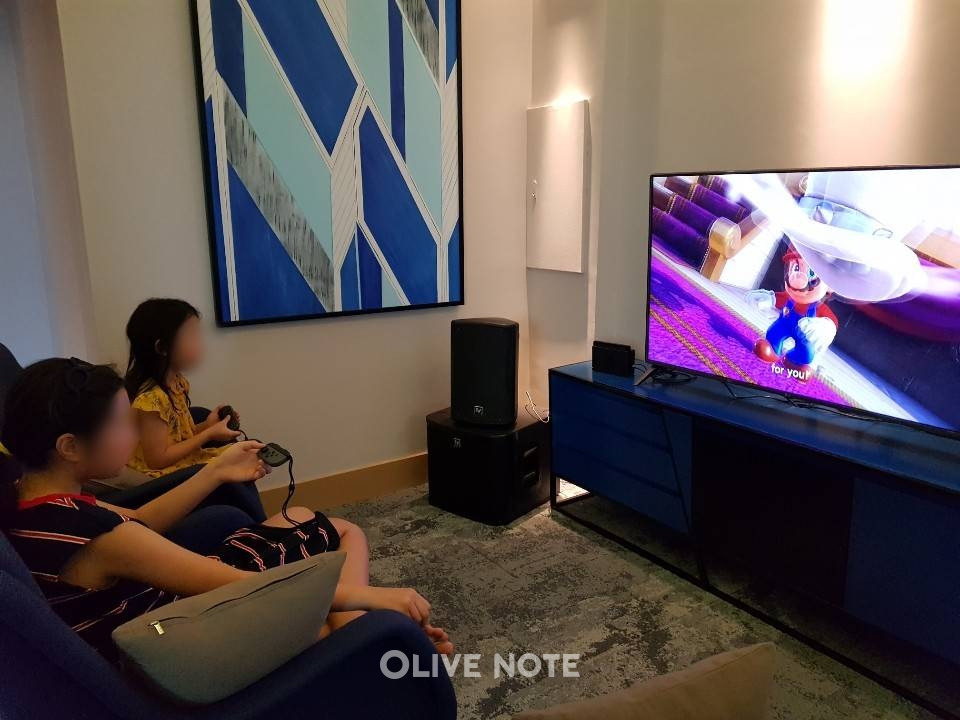 이번엔 아이들이 놀 수 있는 또 다른 곳 '게임존'으로 가볼게요. 게임존은 어른들도 이용할 수 있어요. 이렇게 플레이스테이션(?) 같은 게임기도 있고요. 생전 처음 게임기라는 걸 손에 들어본 제 딸은 몸이 앞으로 수~욱 나올 정도로 빠져 있네요. 영어 버전이라서 금방 흥미를 잃긴 했지만요. ㅎㅎ