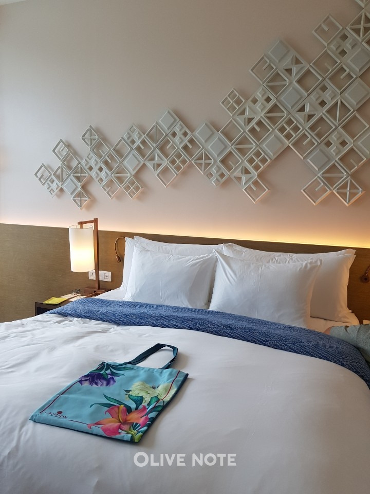 룸 컨디션은 한 마디로 '짱'이에요. 디럭스씨뷰에 묵었기 때문에 통유리 너머로 보이는 전망은 말할 것도 없었고요. 분위기도 화이트와 밝은 우드톤이 조화롭게 섞여 럭셔리함이 뿜뿜 풍기더라고요. 침대는 킹베드였는데요.