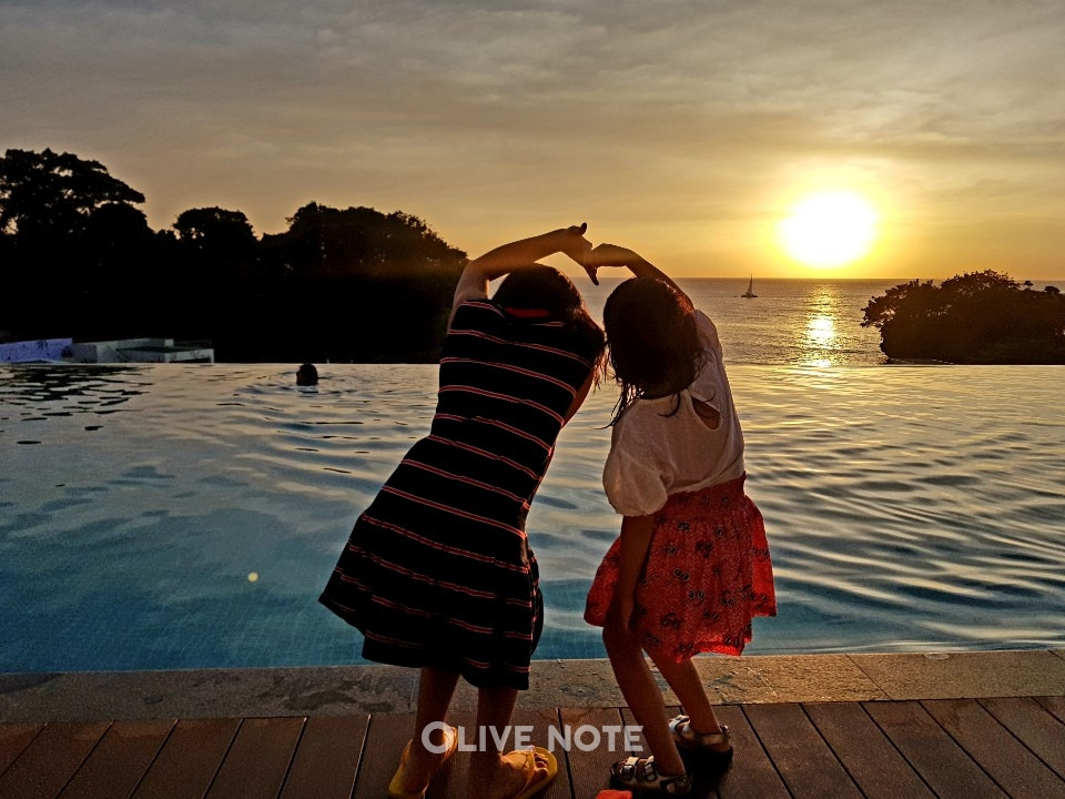 인피니티풀은 수심이 꽤 깊어(약 1.2m) 아이들이 물장난하기엔 좀 그렇고요. 풀 길이가 80m정도로 구명조끼를 착용한 후 수영하기에는 딱 적당해요. 인피니티풀 안에서 그리고 풀 밖 썬 베드에 누워서, 어디서 봐도 전망이 아주 그냥 끝내줍니다.