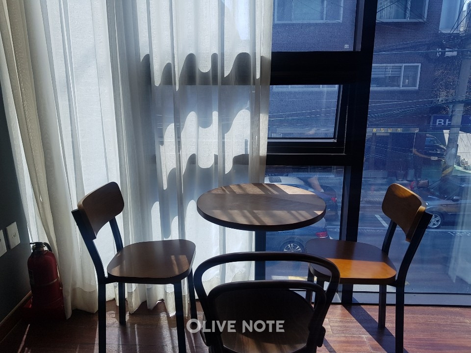 인테리어는 매우 깔끔하고 딱 떨어지는 모던한 스타일이에요. 요즘 카페 트렌드에 맞게 말이죠. 암녹색 페인트로 칠한 벽과 원목 테이블은 고즈넉한 분위기를 풍겨요.