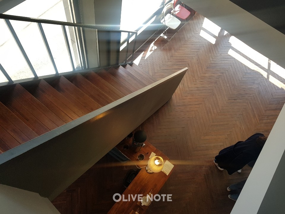 친절한 직원 덕분에 바로 코 앞에 있는 2호점으로 들어갔습니다. 1층엔 좌석이 없어요. 웨이팅용 의자와 벤치, 계산대, 커피 내리는 주방이 있어요. 주문 후 계단을 올라 2층에 자리 잡아야 해요. 단, 사람이 많다면 2층으로 올라가 자리부터 잡는 게 좋아요. 주문받는 직원도 자리를 잡았냐고 물어보더라고요.
