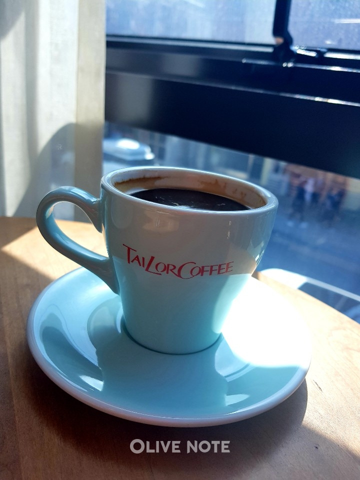 드디어 음료가 나오고 쟁반을 받아든 순간 깜짝 놀랐어요. 어머, 커피잔이 너무 예쁘잖아요~!! 일단 스카이블루 컬러감, 매우 느낌 있고요. 투박한 머그잔이 아닌 마치 고려청자처럼 흐르는 곡선이 아름다워요. 거기에 빨간색 테일러커피 로고를 배색 처리해 시크함을 강조했어요. 스카이블루와 레드의 배색감, 그리고 곡선의 커피잔 형태와 딱딱한 로고의 믹스매치가 오히려 감각적인 느낌을 더해요.