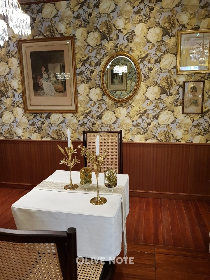 1층 우측에는 카페 테이블이 있는데요. 중세 유럽풍으로 인테리어를 해뒀어요. 만약 '카페 더 가든'에 방문할 계획이라면 옷을 드레시하게 입고 가보세요. 그리고 여기서 사진 한 장 찍어보는 거예요. 인생 샷 한 장 건질 수 있을 것 같아요. 제가 방문했을 때 인플루언서(SNS상에서 영향력 있는 개인)로 보이는 몇몇 분이 화려한 풀 스커트에 블링블링 액세서리를 하고 사진을 찍으시던데 정말 분위기 최고더라고요.