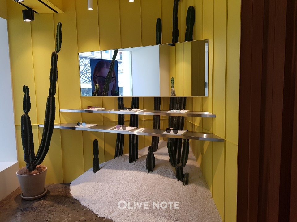 건물 안으로 들어가면 1층 좌측에는 젠틀펜디 제품들이 진열돼 있어요. 직접 써볼 수도 있답니다. 지금까지의 젠틀몬스터 선글라스와는 살짝 다른 느낌의 디자인인데요. 개인적으로 매우 마음에 들었어요. 젠틀몬스터가 국내 브랜드라서 그런지 한국인 얼굴형에 잘 어울리는 디자인을 뽑는 것 같아요.