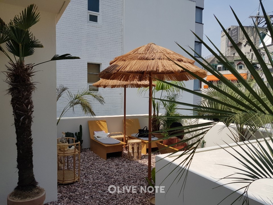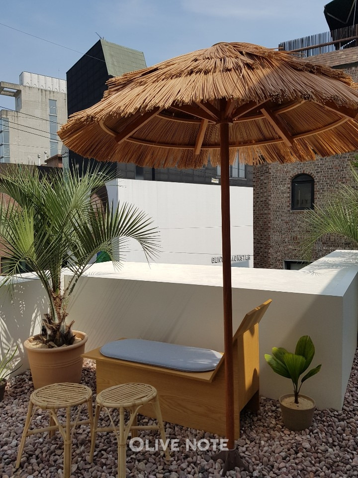 마치 휴양지에 와 있는 느낌! 딱 봐도 느껴지죠? 지금보다 더 더워지면 여기 앉아 있기 너무 힘들어질 수 있으니(물론 카페 측에서 방법을 마련하겠지만요) 기온이 더 오르기 전에 가보길 추천해요.