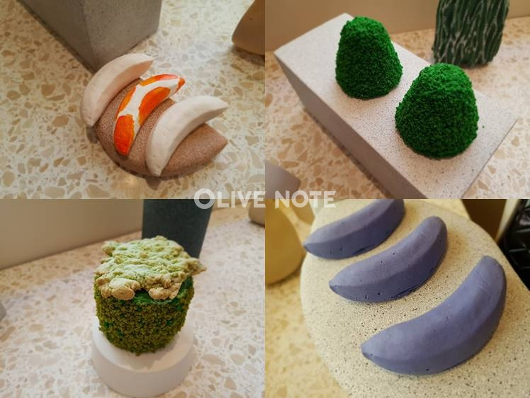 제가 또 한 번 놀란 건 다름 아닌 이 디저트들 때문이에요. 사진을 참고해 주세요! 네, 장식품 아니고 디저트들이랍니다. 바나나도 디저트고요. 초록색 화산섬 모양도 디저트랍니다. 모스키오 페라 몬테로사 미뇽 이름도 참 감각적이죠?