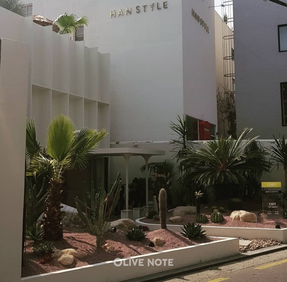 젠틀펜디의 '카페 더 가든'은 가로수길 초입(신사중학교 쪽) 골목 안쪽에 있어요. 상가밖에 없는 골목에 선인장이 가득한 정원이 확 튀어요. 이 사진만 봐도 서울에서도 핵 도심인 가로수길에서 찾아보기 힘든 감각적인 분위기의 카페인 거 아시겠죠? 흰색 건물은 단조롭지만 인테리어가 매우 특색 있어요. 그래서 사진을 찍으면 아주 예쁘게 나온답니다. ^^