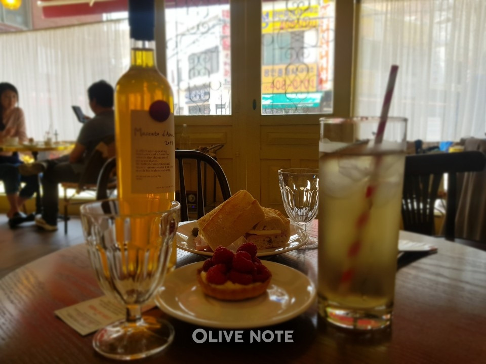 저는 이 집 시그니처라는 '모스카토 다스티' 한 병을 우선 시켰고요.(스위트한 맛과 향으로 유명한 이탈리아 와인 이름에서 따온 듯하네요.) 루즈펀치, 잠봉버터, 라즈베리 타르트, 트러플 따흐띠네뜨를 시켰어요.