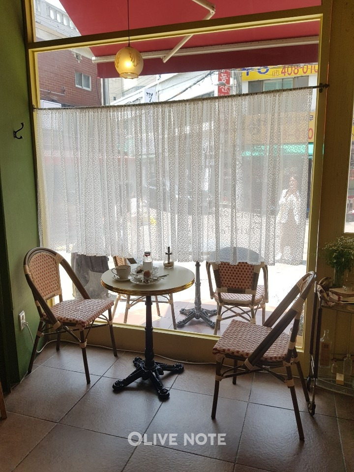 숨을 조금 돌린 후 내부를 쭉~ 둘러보니 외부만큼이나 유럽 분위기가 물씬 풍기도록 인테리어해뒀어요. 원형테이블에 라탄 의자, 레이스 커튼, 아기자기한 각종 소품들까지 말이죠.