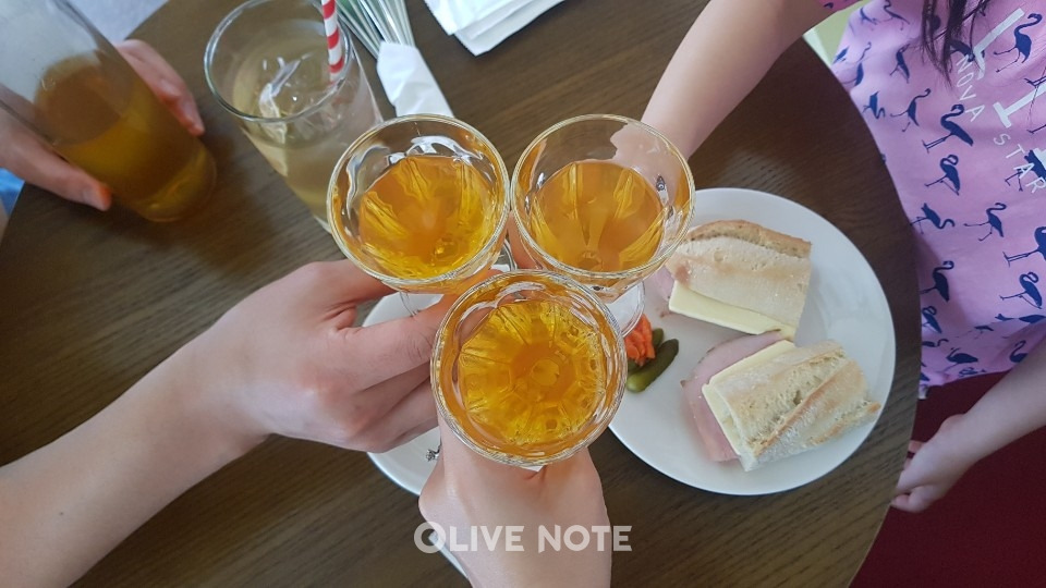 모스카토 다스티를 잔에 따라 셋이서 건배도 해봤어요. 달달한 아이스 홍차라 아이도 먹을 수 있어요. 알코올은 들어가지 않았지만 카페인이 있기 때문에 많이 마시면 안 돼요. 그런데 달달해서 그런지 아이는 계속 마시려고 하더군요. ^^;;;; 솔직히 마시기 전에는 맛을 의심했는데 한 모금 마신 뒤 '역시 시그니처구나!' 했답니다. 스파클링 와인 같지만 알코올이 없는 티라서 시원하고 뒷맛이 텁텁하지 않고 깔끔하더라고요.
