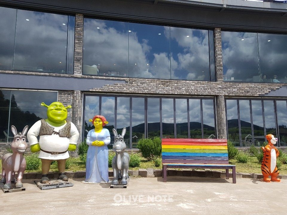 승마 시간을 기다리면서 아이와 함께 목장을 즐겨보세요! 밖으로 나가면 슈렉을 필두로 한 애니메이션 주인공 캐릭터들이 반겨주는데요. 아이들은 이런 것만 봐도 좋아하죠. ㅎㅎ 저 의자에 앉아서 사진을 찍으니까 참 예쁘게 나오더라고요.