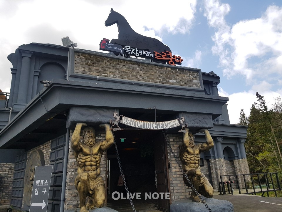 드루쿰다는 제주도 서귀포시 표선면에 있어요. 주차장에 주차를 한 뒤 이 신기한 정문을 지나면 카페 내부로 바로 이어지는데요. 멋진 조각상으로 만든 기둥이 눈에 띄죠? 유럽에서나 볼 수 있는 건물양식인데요. 덕분에 이 문을 지나면 뭔가 새로운 세상이 펼쳐질 것 같은 느낌이 들어요.