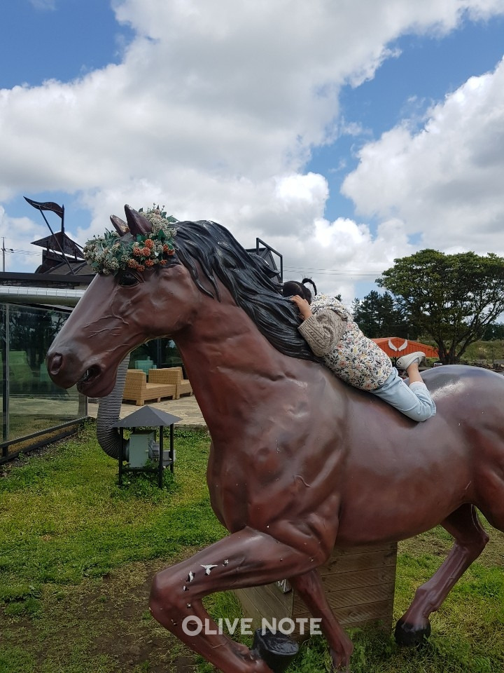 아이는 말 동상 위에 올라 '이랴 이랴~' 진짜 말을 타기 전 연습도 해봐요. (어린아이들도 탈 수 있게 계단 받침이 있으니 걱정 마세요)