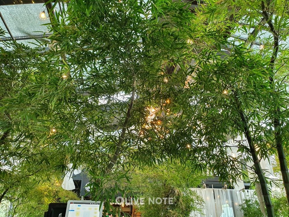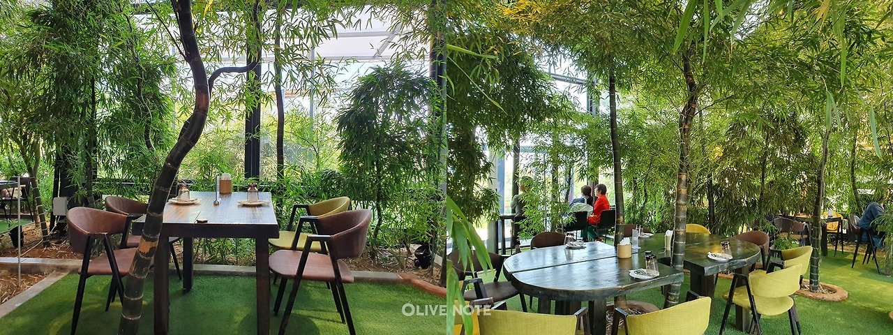 저는 식물 콘셉트의 카페를 좋아하는 편인데요. 이렇게 대나무에만 포커스를 맞춘 카페는 처음이었어요. 실내 가득한 대나무에 입구에 들어서자마자 청량함이 뿜뿜! 대나무 덕분에 카페 내부가 세상 초록초록한데 천장부터 벽까지 온통 통유리로 돼 있어 자연채광도 끝내주더라고요.